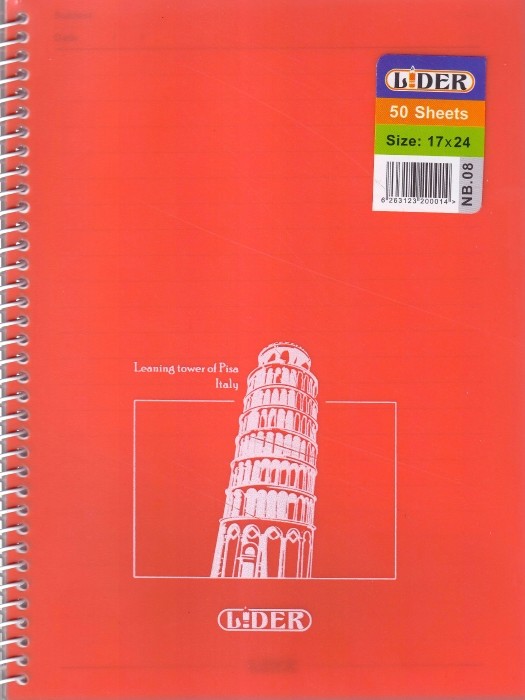 دفتر 50 برگ سیمی جلد طلقی قرمز لیدر طرح برج پیزا