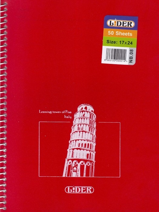 دفتر 50 برگ سیمی جلد طلقی قرمز لیدر طرح برج پیزا